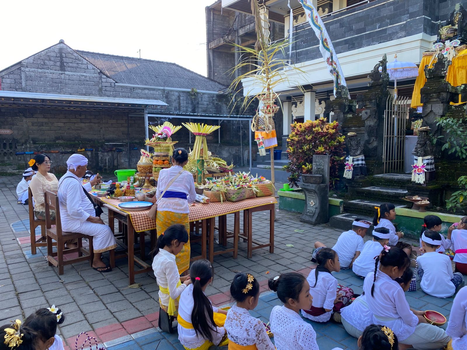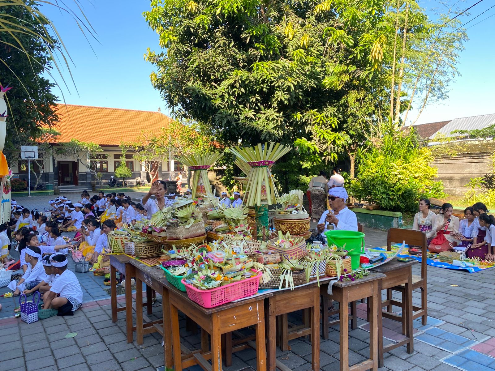 Sejak pagi hari, suasana sekolah telah dipenuhi dengan nuansa religius dan budaya Bali yang kental. Seluruh siswa, guru, dan staf hadir mengenakan pakaian adat Bali, mencerminkan rasa hormat serta kekhidmatan dalam mengikuti rangkaian upacara. Area sekolah dihiasi dengan penjor dan perlengkapan upacara yang tertata rapi, menciptakan suasana yang sakral dan penuh keindahan.